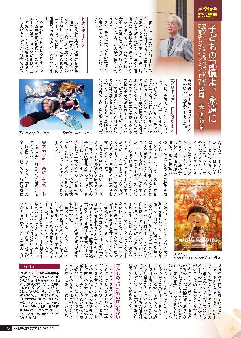 - 総会記念講演 「子供の記憶よ、永遠に」 … 鷲尾 天 氏(S59卒)