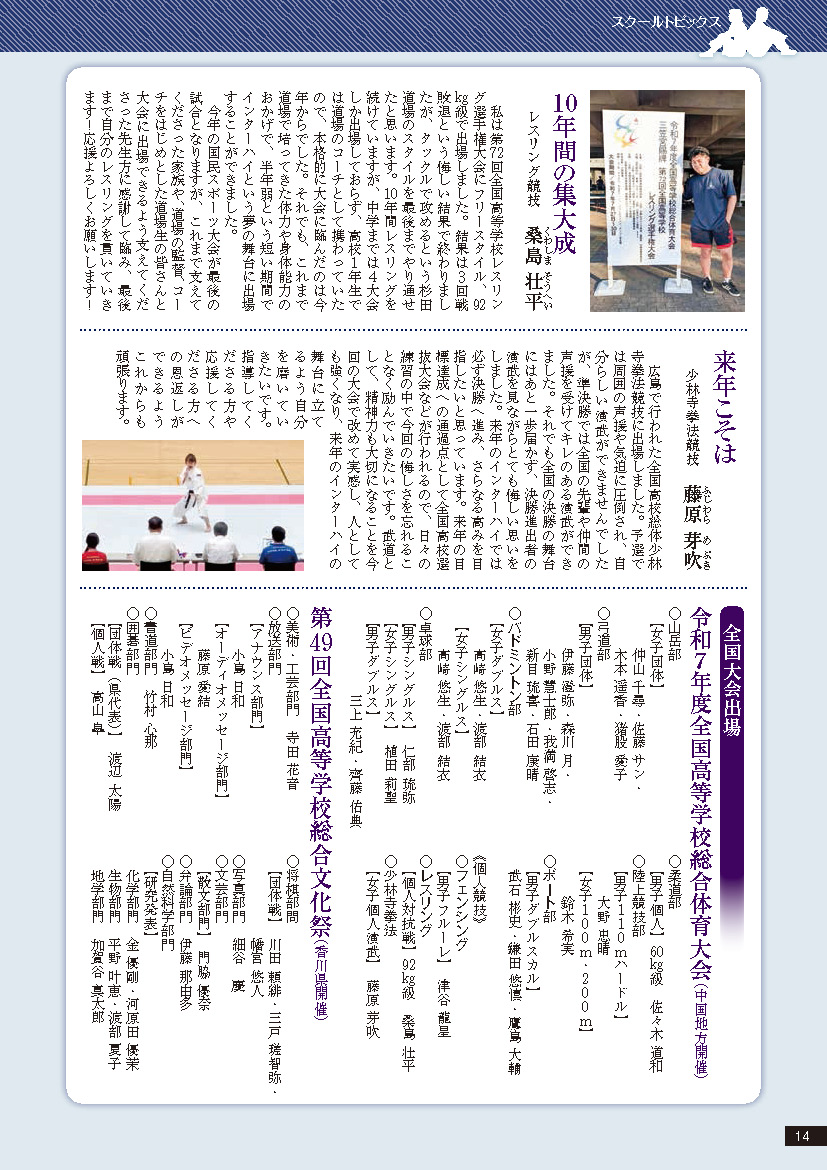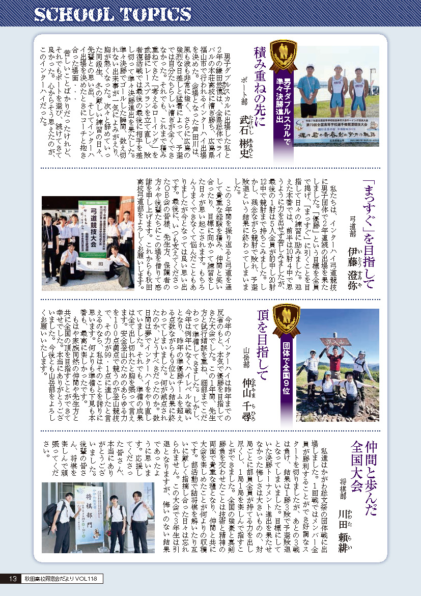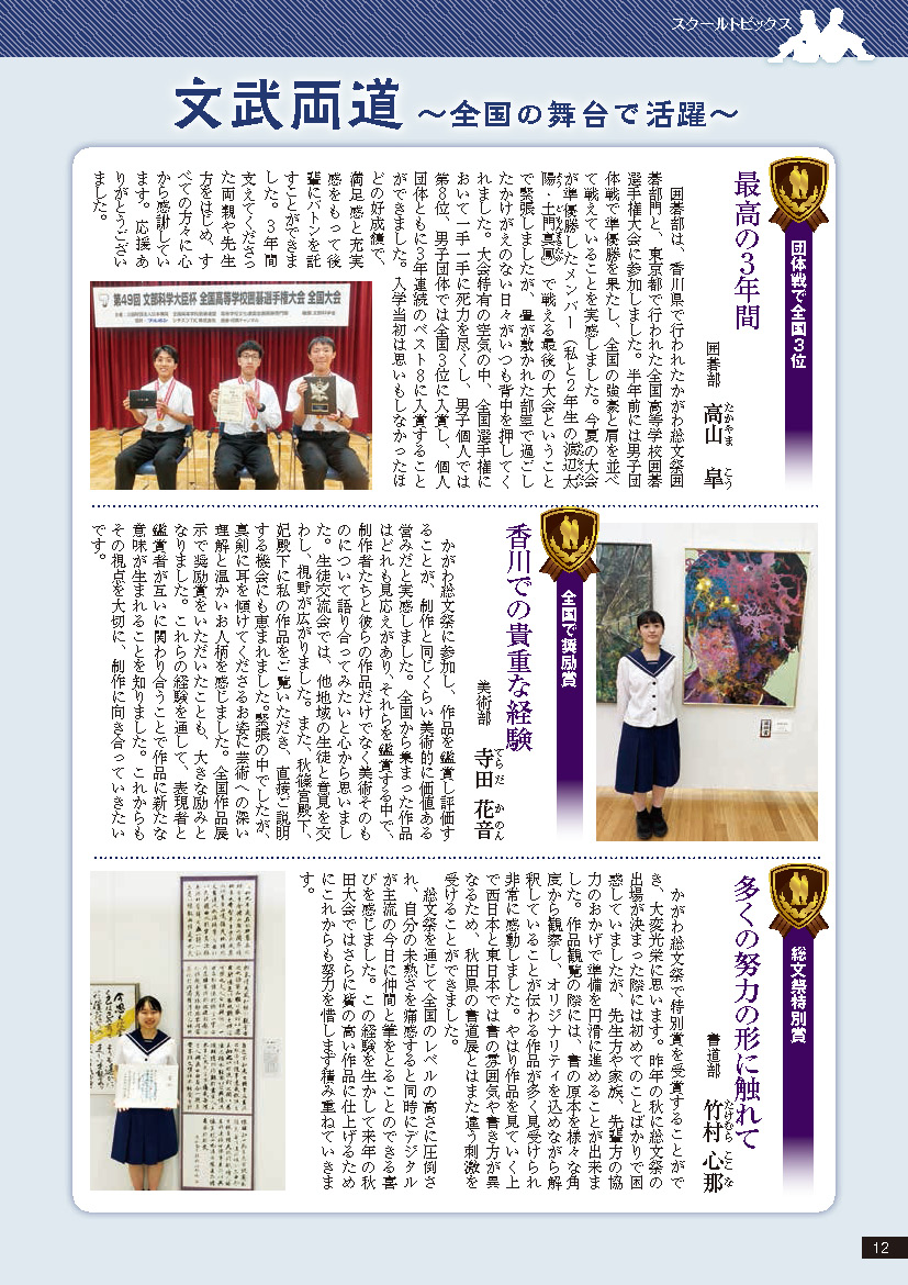 - 文武両道 囲碁部 全国選手権団体戦で3位、美術部 全国総文祭で奨励賞