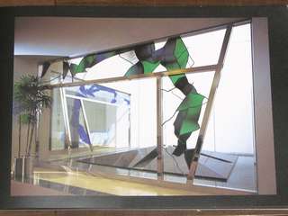 サッシを4重にして、そのそれぞれに違ったステンドグラスを入れて、ガラスのデザインの重なりを楽しむ作品になっています。ドラマの撮影などにも何度か使用された事があります。